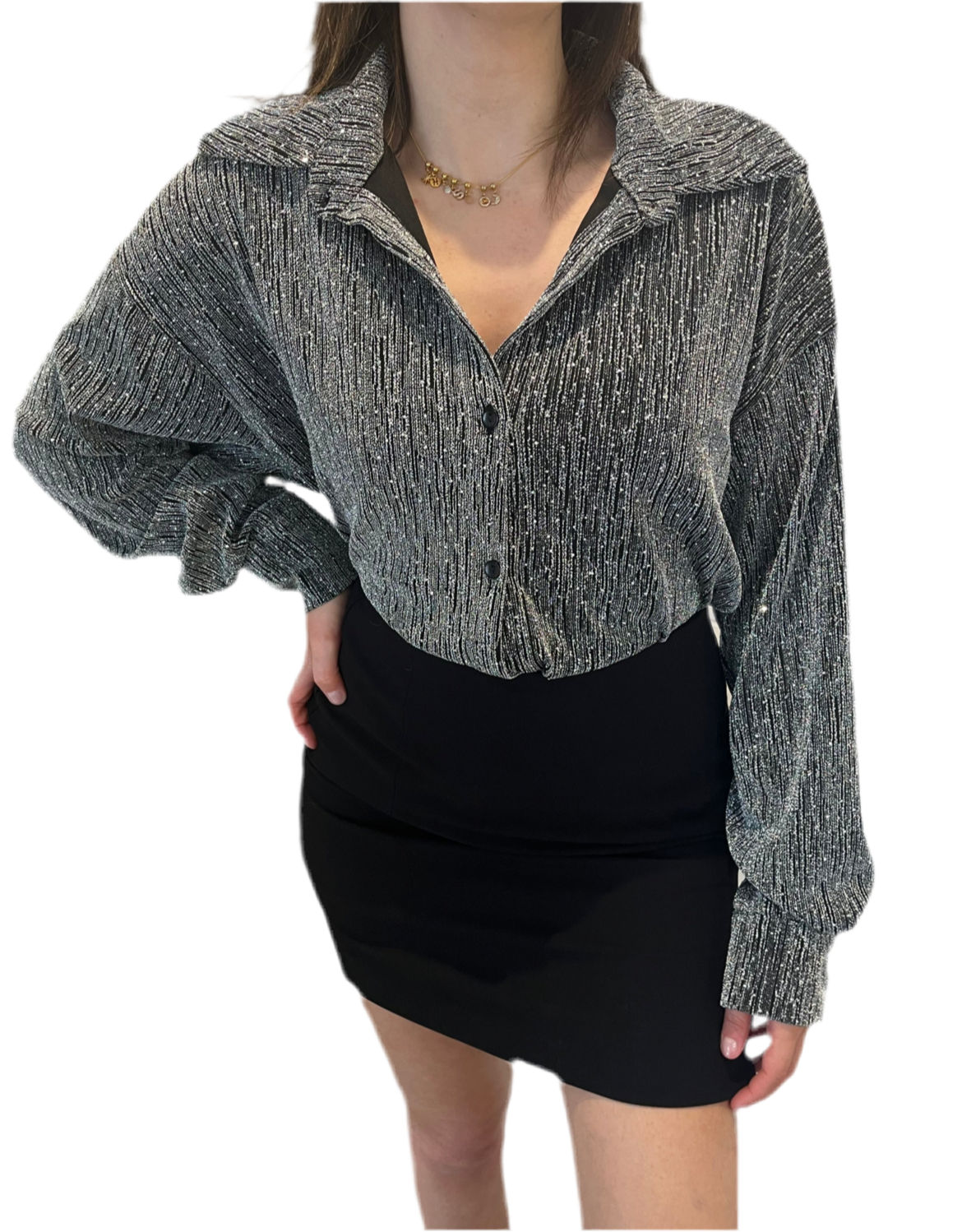 Ajoutez une touche d'élégance et de glamour à votre garde-robe avec notre chemise Céline. Sa teinte argentée brillante illumine instantanément votre tenue, tandis que les détails en strass apportent une touche sophistiquée et chic.