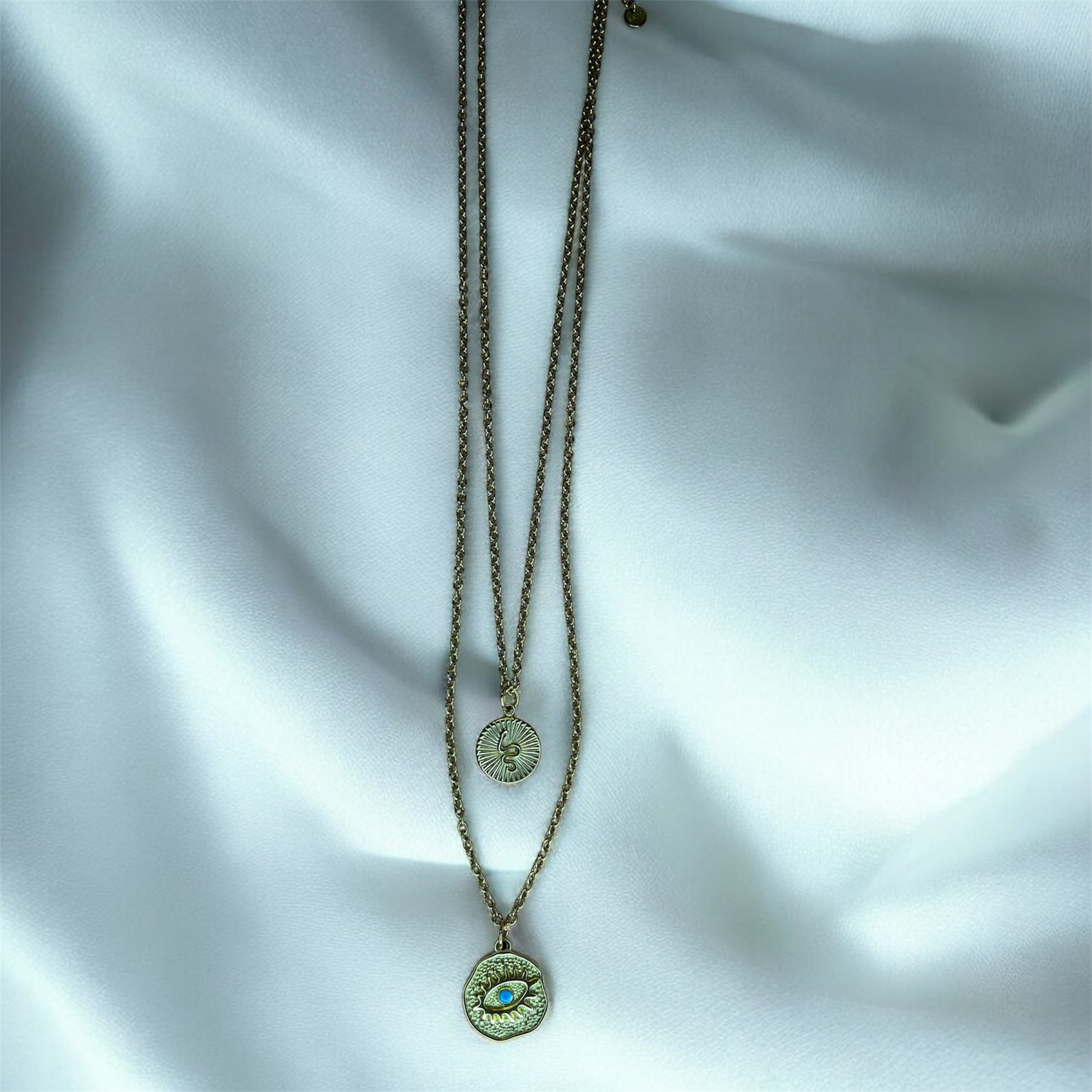 Sublime ton look avec notre collier double rang en acier inoxydable, orné de deux pendentifs délicats.