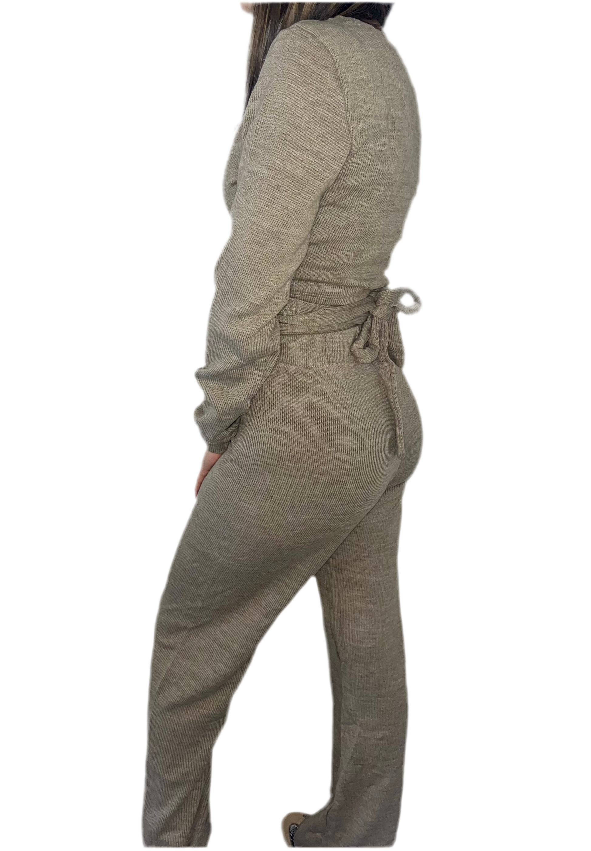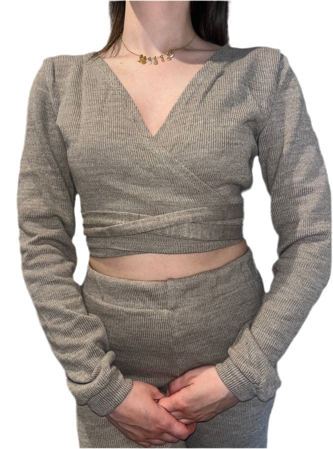 Ajoutez une touche cosy et élégante à votre dressing avec notre ensemble Bear. Composé d’un top cache-cœur et d’un bas assorti, il est l’alliance parfaite entre style et confort. Sa teinte marron clair douce en fait une pièce idéale pour toutes la saison.