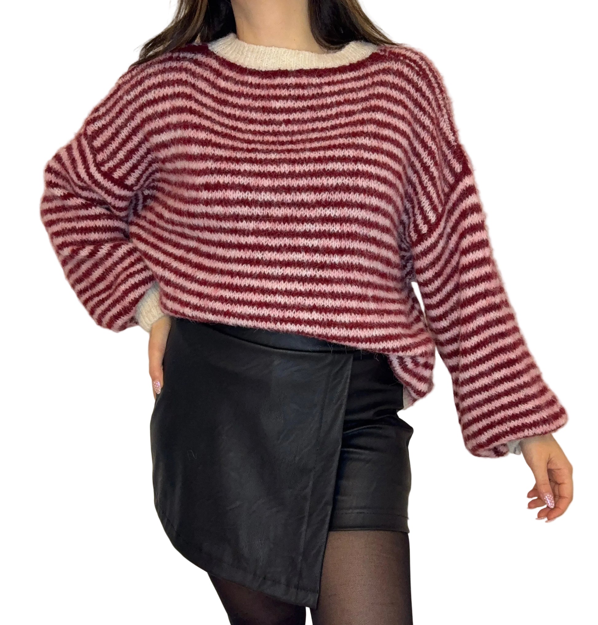 Craquez pour la douceur et le style du Pull Ruby, une pièce rayée aux tons bordeaux, chaleureuse et tendance.