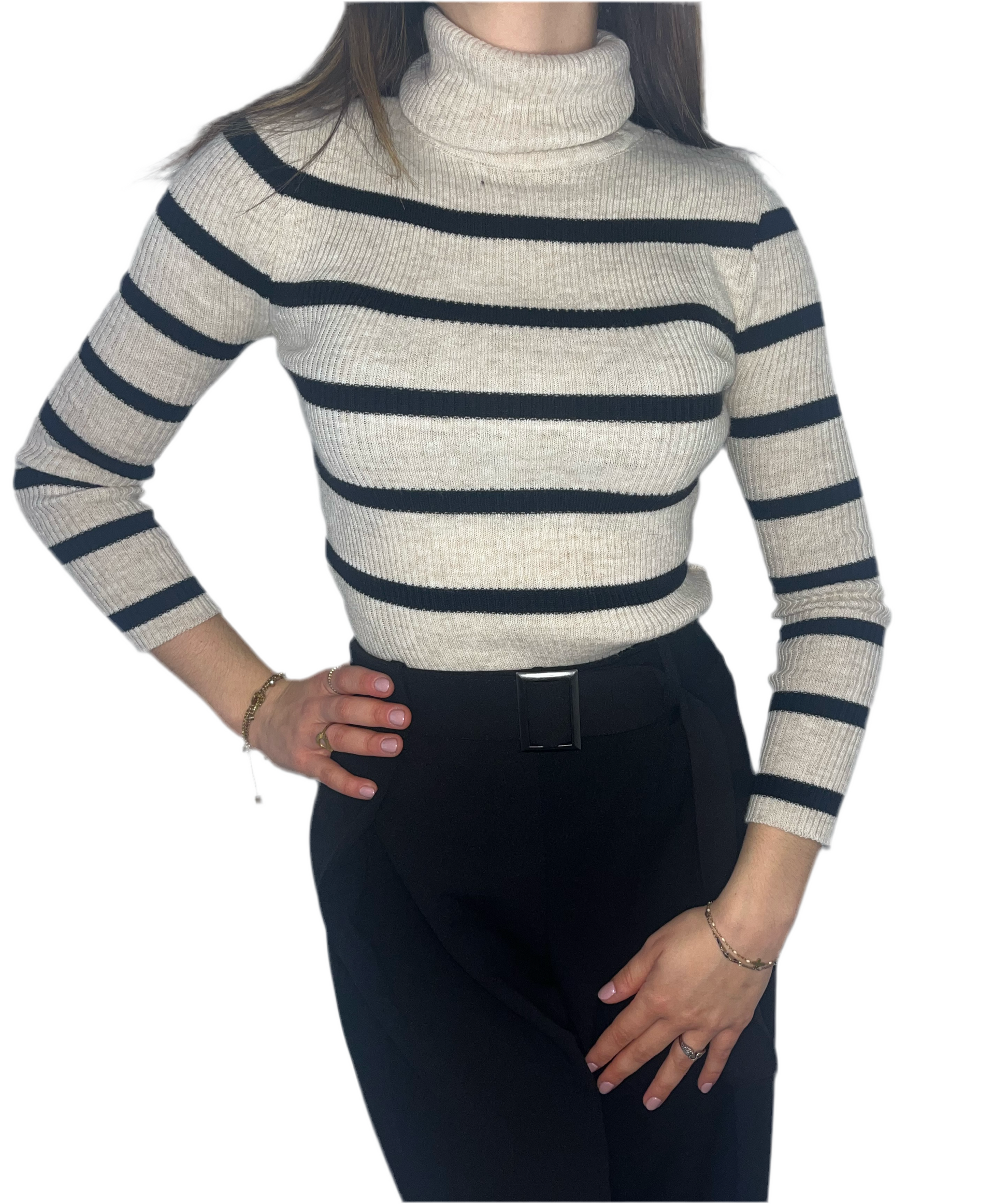 Ajoutez une touche intemporelle et élégante à votre garde-robe avec notre Top Marine. Sa coupe moulante et son col roulé en font une pièce idéale pour des looks chics et confortables. La teinte beige marinière apporte une touche douce et raffinée, parfaite pour toutes les occasions.