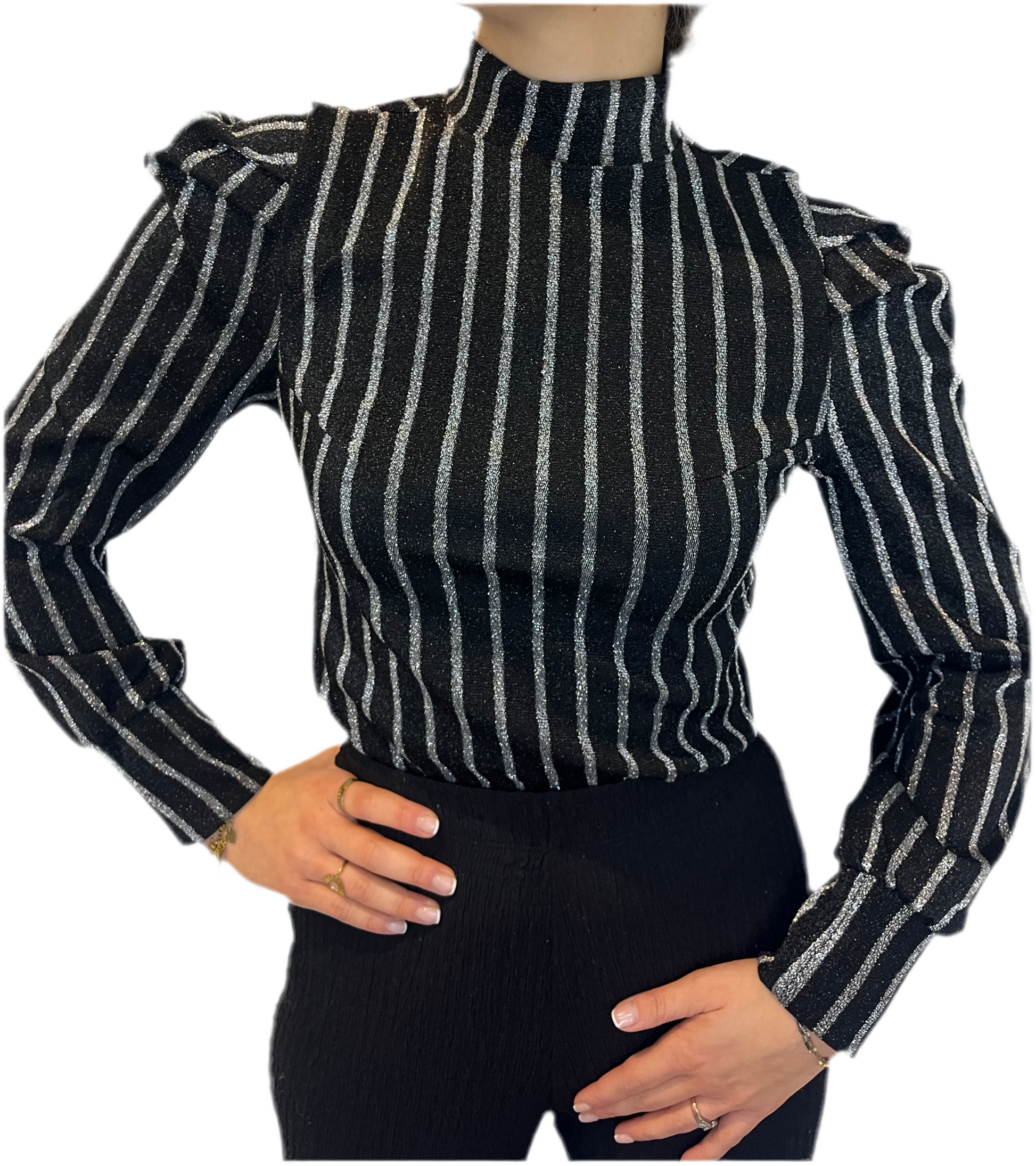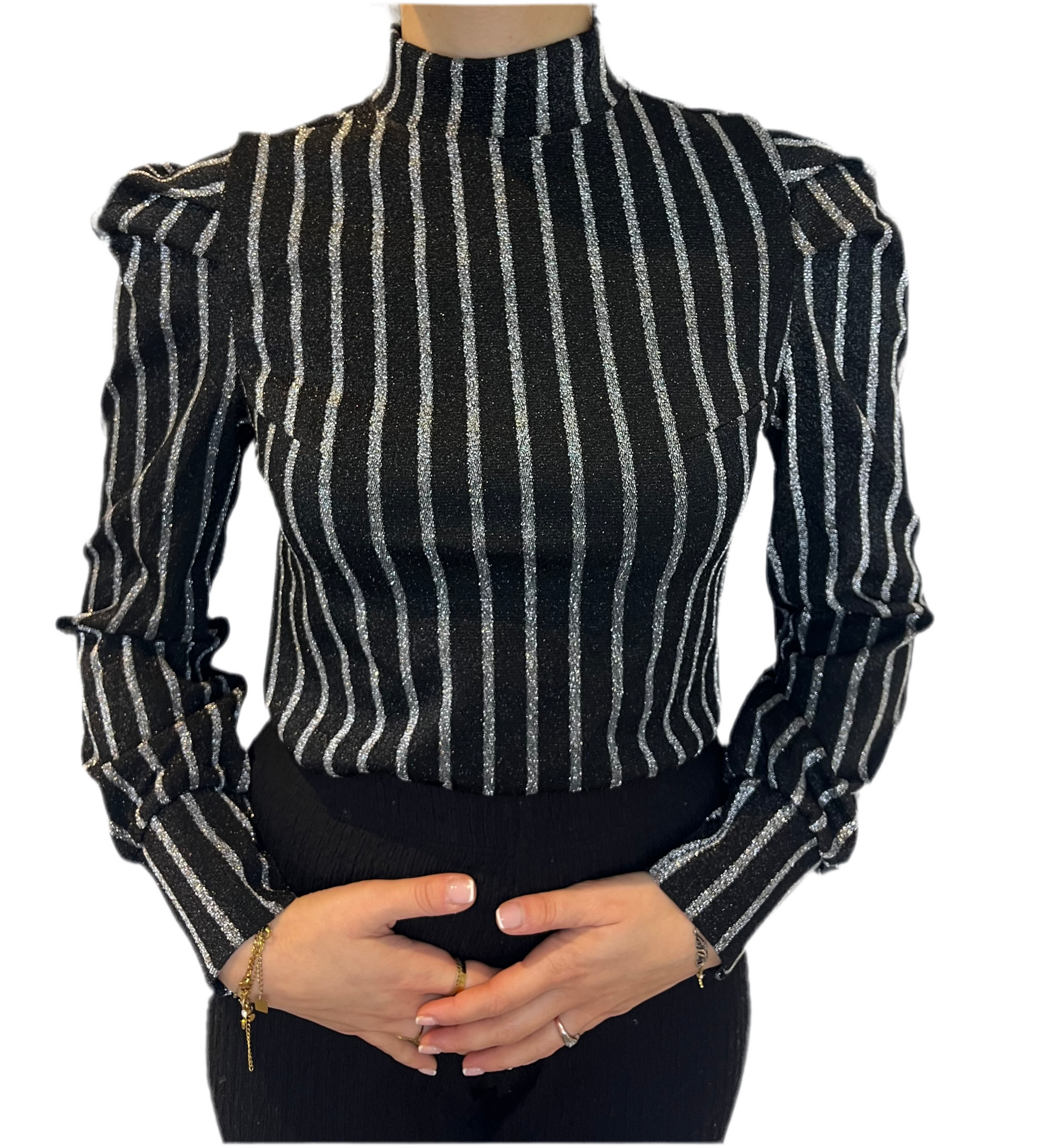 Le top "Cathy" allie chic et confort avec ses rayures argentées lumineuses et sa doublure délicate. Son col roulé et ses deux boutons à l’arrière ajoutent une touche sophistiquée à votre tenue, parfaite pour les soirées ou les événements spéciaux.